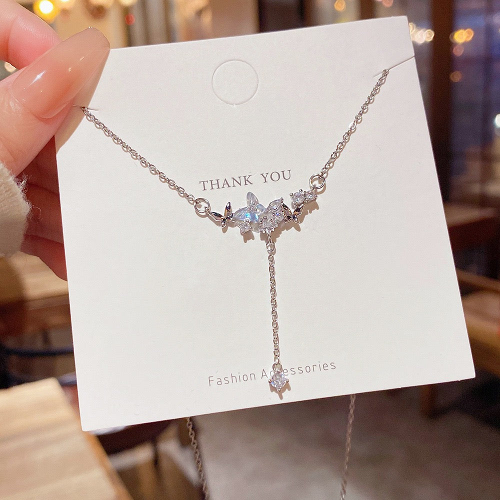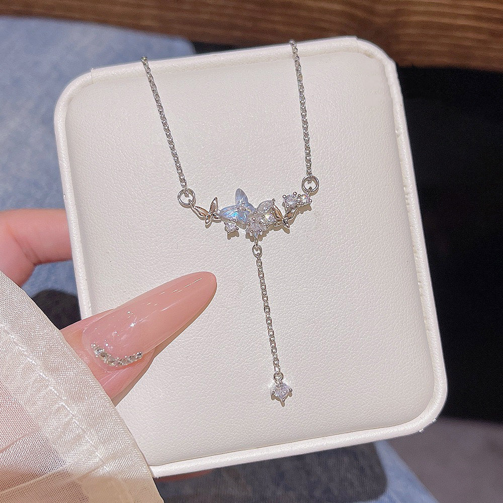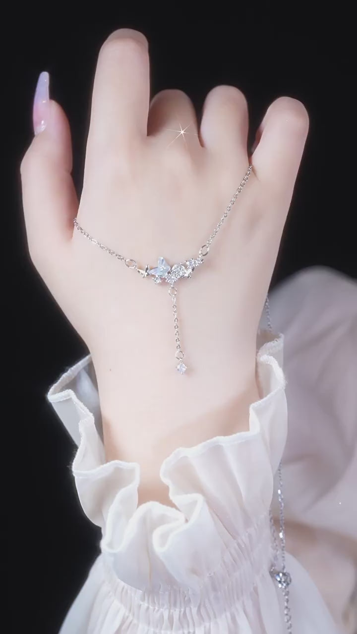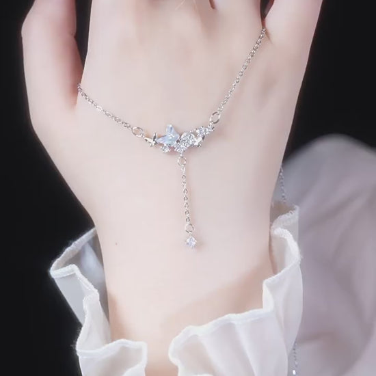 Eine traumhafte Verschmelzung von Magie und Natur, die Butterfly Hanging on Stars Necklace fängt die bezaubernde Schönheit eines Schmetterlings ein, der anmutig zwischen den Sternen hängt. Dieses verspielte Schmuckstück symbolisiert Transformation, Freiheit und die grenzenlosen Möglichkeiten, die auf Sie warten. Gefertigt, um die Essenz einer magischen Nacht einzufangen, verleiht es Ihrem Look einen Hauch von Wunder und Eleganz.