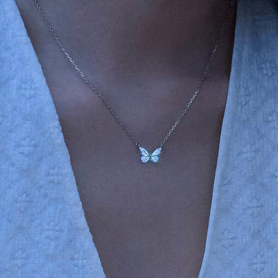 Diese bezaubernde Halskette besticht durch ein zartes Schmetterlingsdesign in einem traumhaften Blauton. Sie leuchtet sanft im Dunkeln und verkörpert Eleganz und Magie zugleich. Ob bei Tag oder Nacht getragen, der Leuchteffekt verleiht Ihrem Look einen Hauch von Geheimnis und Wunder. Perfekt für besondere Anlässe oder den Alltag – sie verleiht ein verspieltes Funkeln, das nie unbemerkt bleibt.