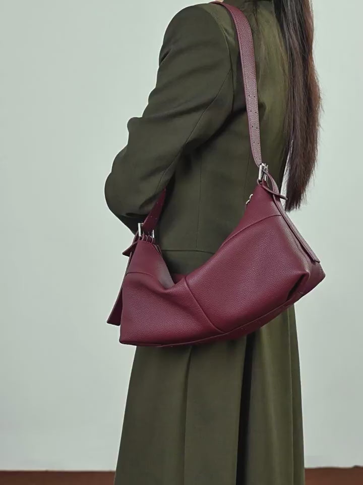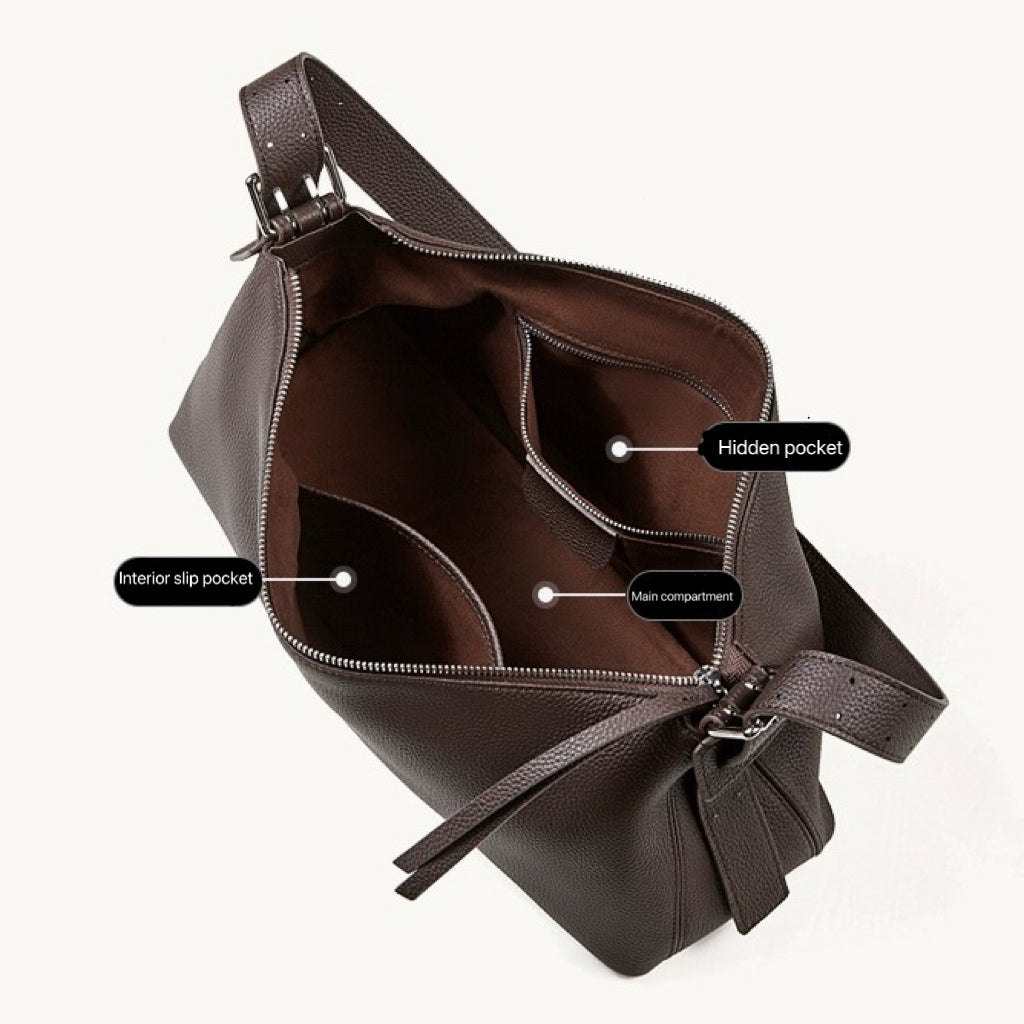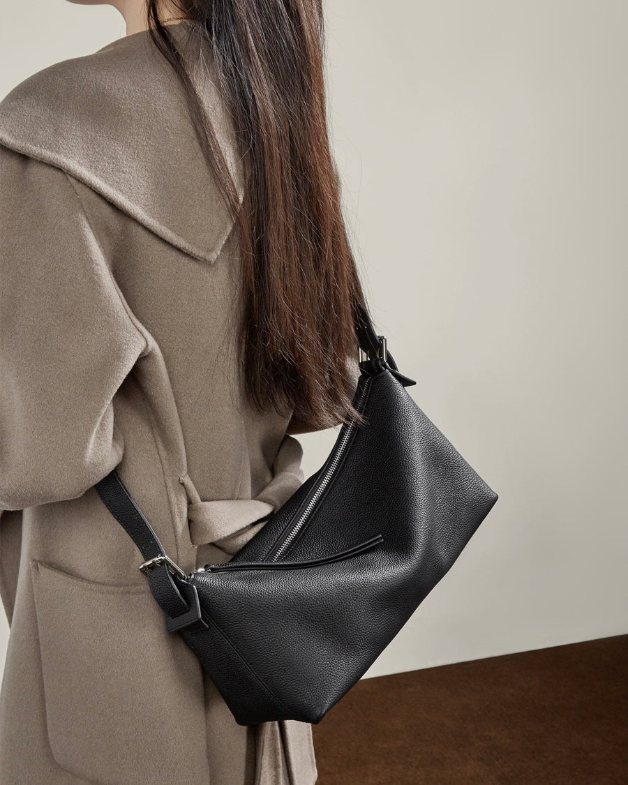 Definieren Sie moderne Eleganz neu mit einer Silhouette, die das Gewohnte durchbricht. Gefertigt aus erstklassigem vollnarbigem Rindsleder, besticht diese Hobo-Tasche durch eine markante asymmetrische Reißverschlusslinie und edle Schnallenbeschläge. Sie ist ein Stück für die Frau, die eine „stille Luxus“-Ästhetik sucht – minimalistisch in der Form, doch reich an handwerklichen Details.