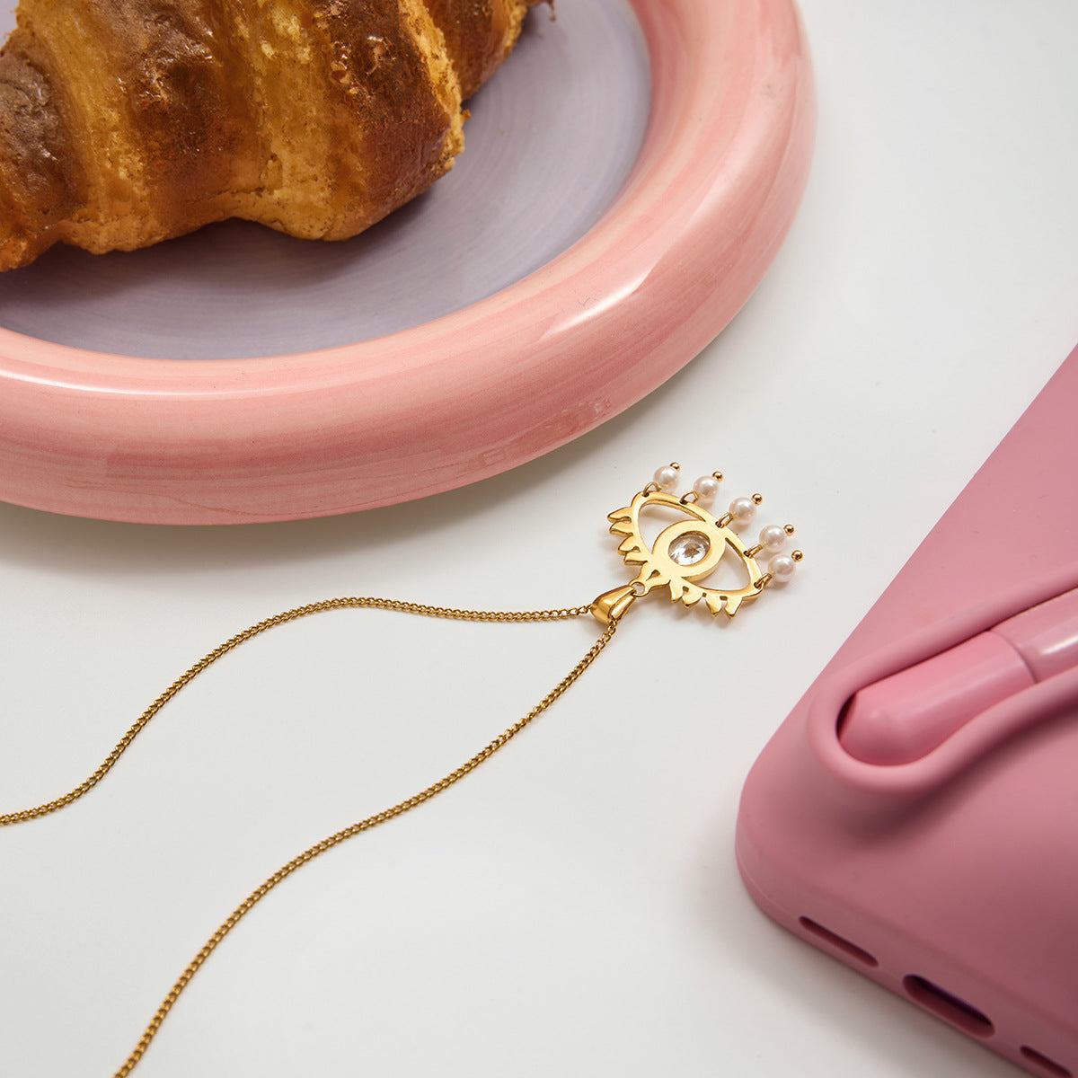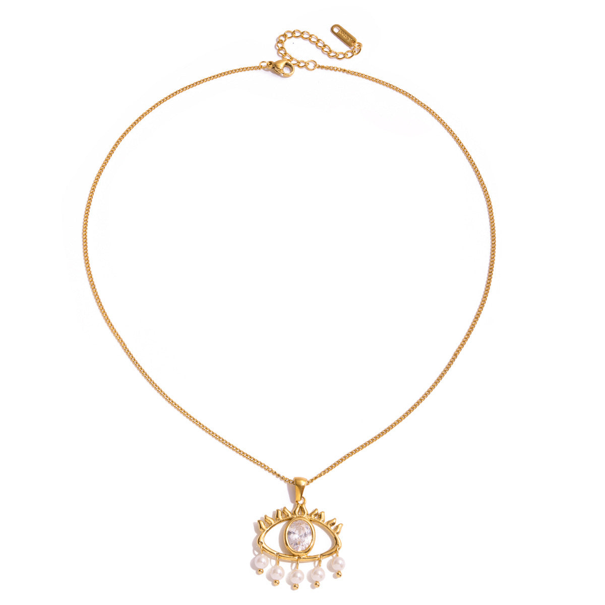 Diese Halskette vereint Vintage-Charme mit modernem Luxus. Der Anhänger aus Titanstahl in Form eines bösen Blicks ist mit einem weißen Zirkonia im Zentrum und zarten Perlen verziert. Gefertigt aus Edelstahl mit einer vakuumplattierten 18-Karat-Goldbeschichtung, besticht sie durch langanhaltenden Glanz und Robustheit. Mit einer verstellbaren Kette (42 cm + 5 cm) und einem Gewicht von 6,2 g vereint dieses Schmuckstück symbolischen Charme (der böse Blick ist ein zeitloser Schutzgeist) mit zarter Eleganz und ist somit ein außergewöhnliches Accessoire, das sowohl legere als auch formelle Outfits aufwertet.