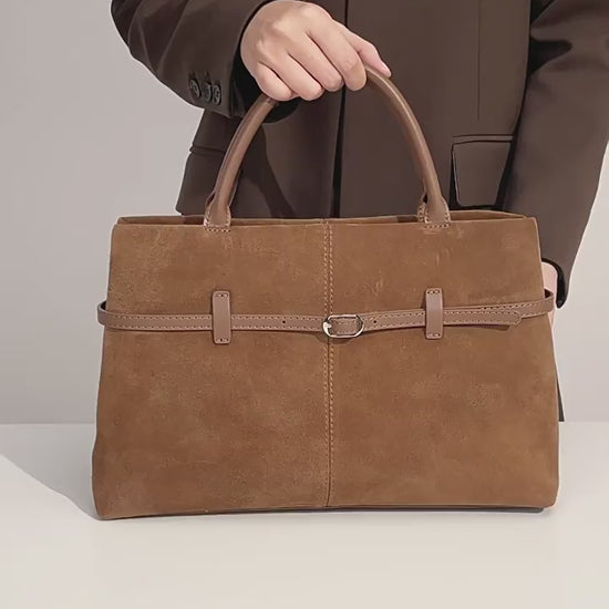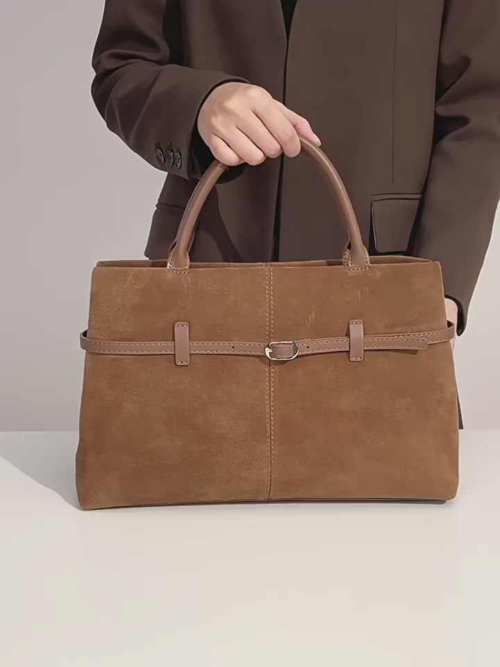 Este bolso tote estructurado de cuero genuino retro de gamuza está elaborado con cuero mate genuino, un bolso tote grande y moderno con forma cuadrada horizontal y rigidez media, perfecto para el uso diario. Cuenta con un cierre de cremallera elegante y un detalle de candado a la moda (elemento de diseño en tendencia). El interior forrado de poliéster incluye un bolsillo secreto con cremallera, un compartimento para teléfono y una capa extra, manteniendo tus esenciales ordenados y seguros. Espacioso pero ligero, combina practicidad con un encanto minimalista, ideal para llevar objetos diarios como bolso de mano o bandolera.