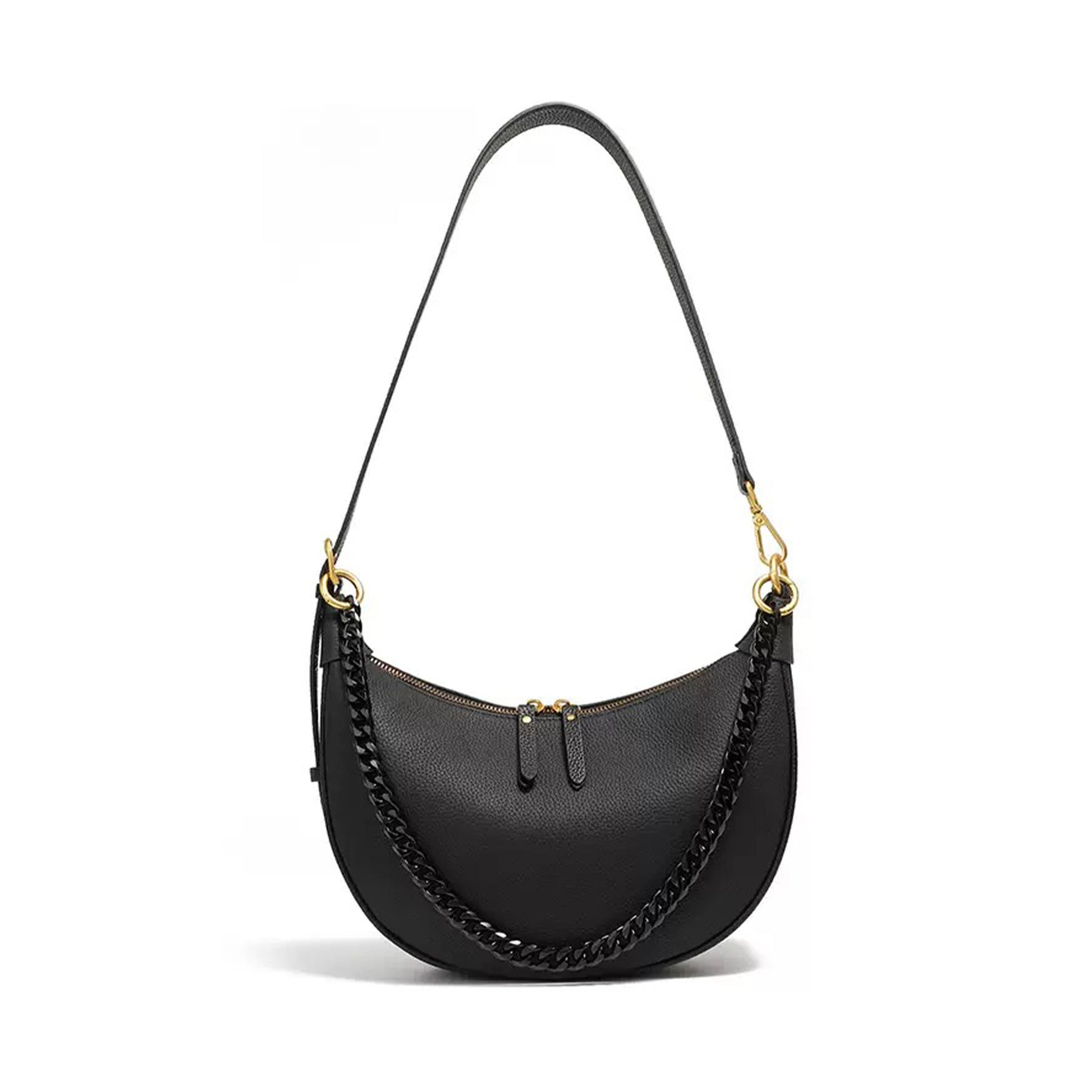 Confectionné en cuir de vachette pleine fleur de première qualité, ce sac à bandoulière en forme de croissant arbore une silhouette élégante et une luxueuse chaîne en métal qui lui confère une touche sophistiquée. Sa fermeture zippée assure sécurité et charme minimaliste. À l'intérieur, la doublure en coton et polyester révèle un intérieur bien organisé avec une poche zippée dissimulée et un emplacement pour téléphone. Conçu pour un porté épaule ou croisé, sa structure mi-ferme en fait un compagnon raffiné pour des looks quotidiens raffinés ou des sorties en soirée.