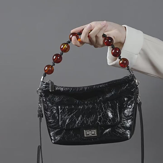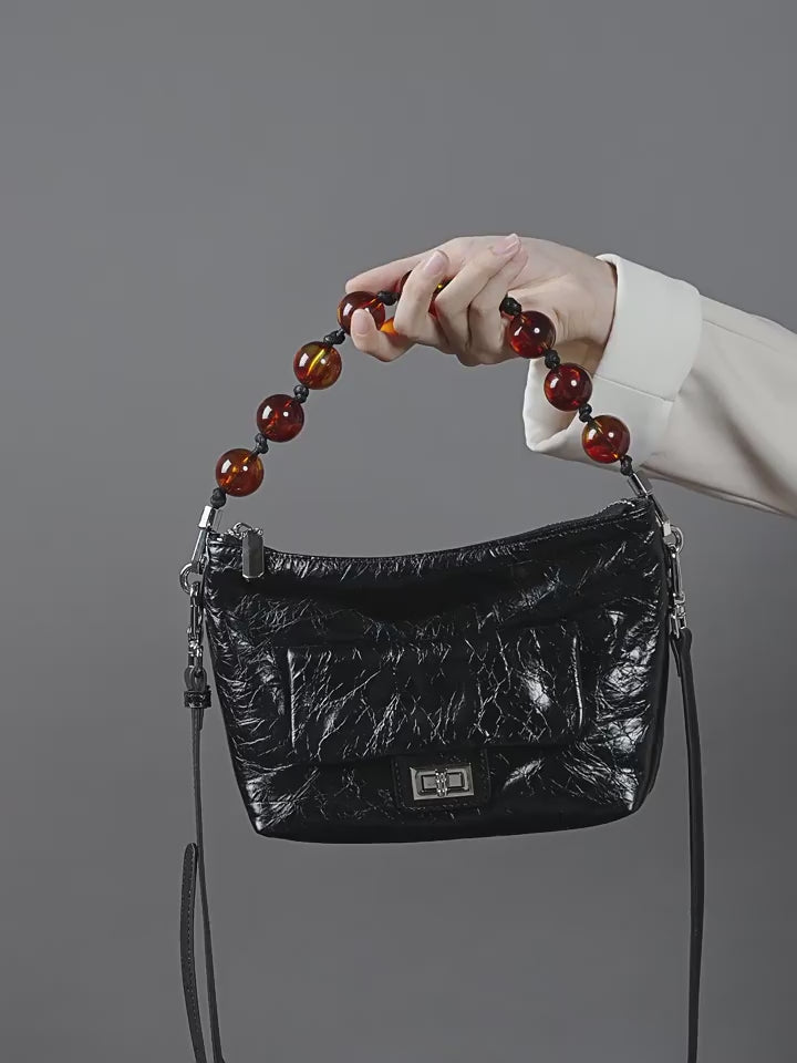 Sac bandoulière rétro en cuir véritable ciré plissé avec chaîne et perles pour femme