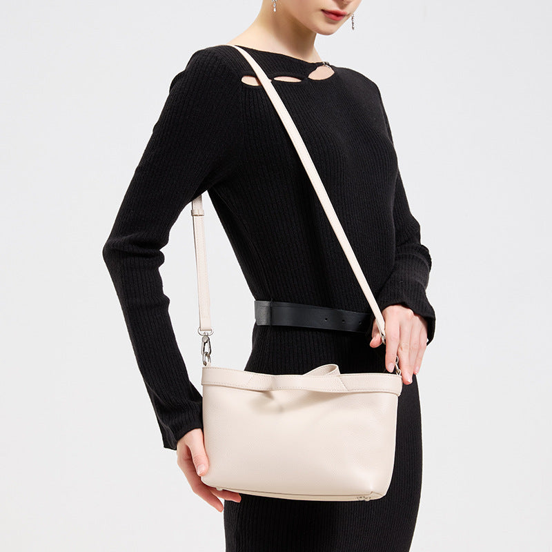 A sleek bucket-shaped form with clean tonal stitching, designed to hold your daily essentials while retaining a polished, compact structure.
