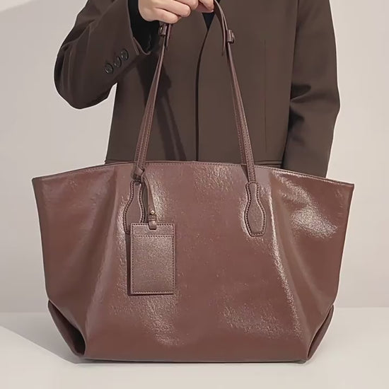 Beg Tangan Kulit Besar Vintage dengan Tag Bagasi Tandatangan