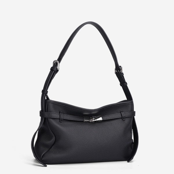 Experience the perfect harmony of relaxed elegance and structured detail. Crafted from premium full-grain pebbled cowhide, this genuine leather bag features a sophisticated slouchy silhouette accented by a signature silver-tone turn-lock and belted side details. It is the quintessential accessory for the modern woman who masters the art of "Quiet Luxury."