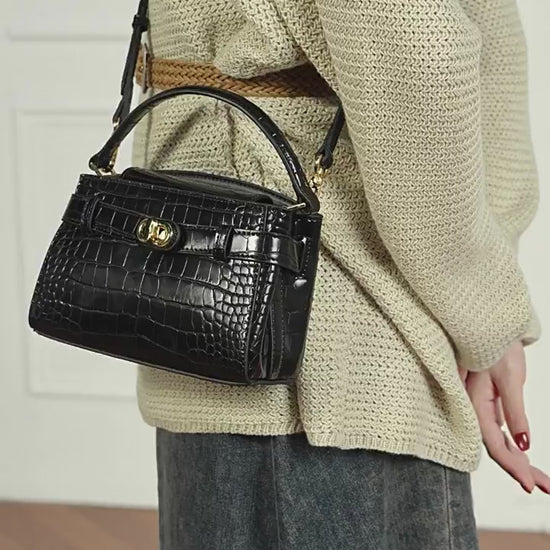 This Croc-Embossed Leather Top-Handle Bag with Signature Gilded Hardware is crafted from premium genuine leather, boasting a trendy crocodile texture that elevates luxury. It’s a small, horizontal square design with medium stiffness—compact yet practical for daily carry. Offered in classic black and elegant off-white, it features a convenient magnetic snap closure for quick access. The polyester-lined interior includes a zippered secret pocket, keeping small essentials like cards or lipsticks neatly organized. It’s the perfect chic companion for dates, errands, or casual outings, blending timeless charm with everyday functionality.