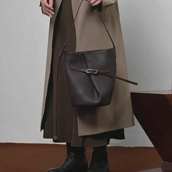 This Niche Design Minimalist Commuter Bucket Bag is a stylish women’s shoulder bag, crafted from premium full-grain cowhide for natural texture and lasting quality. It features a classic bucket shape with medium size and stiffness—sleek yet practical for daily needs. Available in timeless black and rich coffee hues, it has a convenient magnetic closure for easy access. The fabric-lined interior includes an ID pocket to keep small essentials like cards organized. Blending minimalist aesthetics with niche charm, it’s versatile enough for daily matching, elevating casual outfits with understated luxury while ensuring comfort and functionality for everyday use.