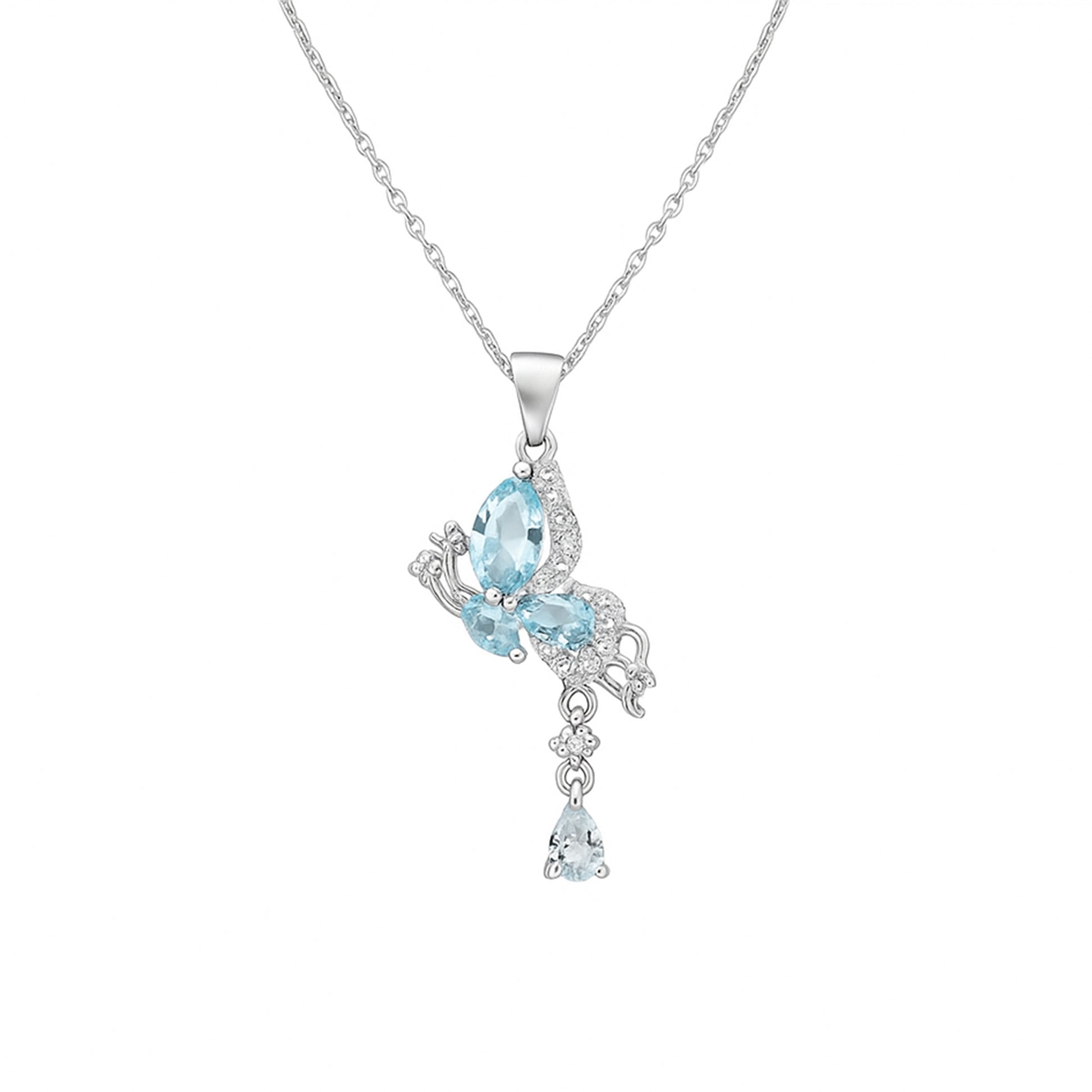 Acest colier elegant prezintă un fluture grațios împodobit cu pietre prețioase albastre strălucitoare. Aripile sale delicate scânteiază cu lumină, capturând un sentiment de libertate și frumusețe. Combinând perfect sofisticarea cu o notă de fantezie, adaugă un farmec radiant atât ținutelor de zi cu zi, cât și ocaziilor speciale. O piesă atemporală care aduce un strălucire subtilă, dar captivantă, stilului tău.